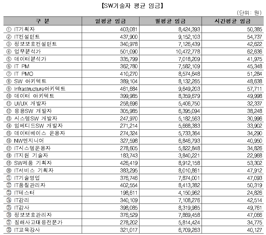 하단 첨부된 파일에는 SW기술자 평균 임금과 직무에 해당하는 설명이 구체적으로 기재되어 있어 관련 업무에 대한 판단이 필요합니다.